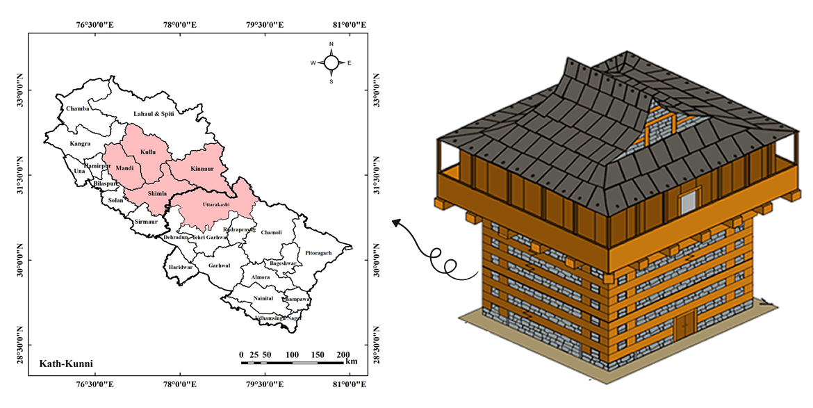 Also known as Koti-Banal architecture in parts of Uttarakhand, Kath-kunni derives its name from its primary construction materials, where 'Kath' refers to timber and 'Kunni' denotes corners. This method, favored by people across various socioeconomic levels, thrives in high-altitude areas abundant in timber.