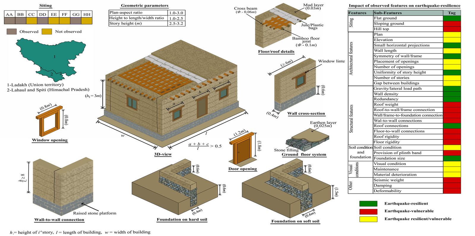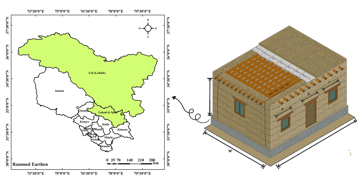 Rammed earth construction remains prevalent in rural areas such as Lahaul and Spiti district villages like Lasar, Hansa, Kyato, and others along the Manali to Kaza route. Similarly, it can be observed in Leh's union territory villages like Rumtse and Miru along the Manali to Leh route, as well as in Ladakh's Nimmu, Nurla, Lamayaro, and others along the Leh to Srinagar route. These regions, falling under seismic zone IV according to India's current seismic zonation map, are also characterized by gentle to moderate slopes.