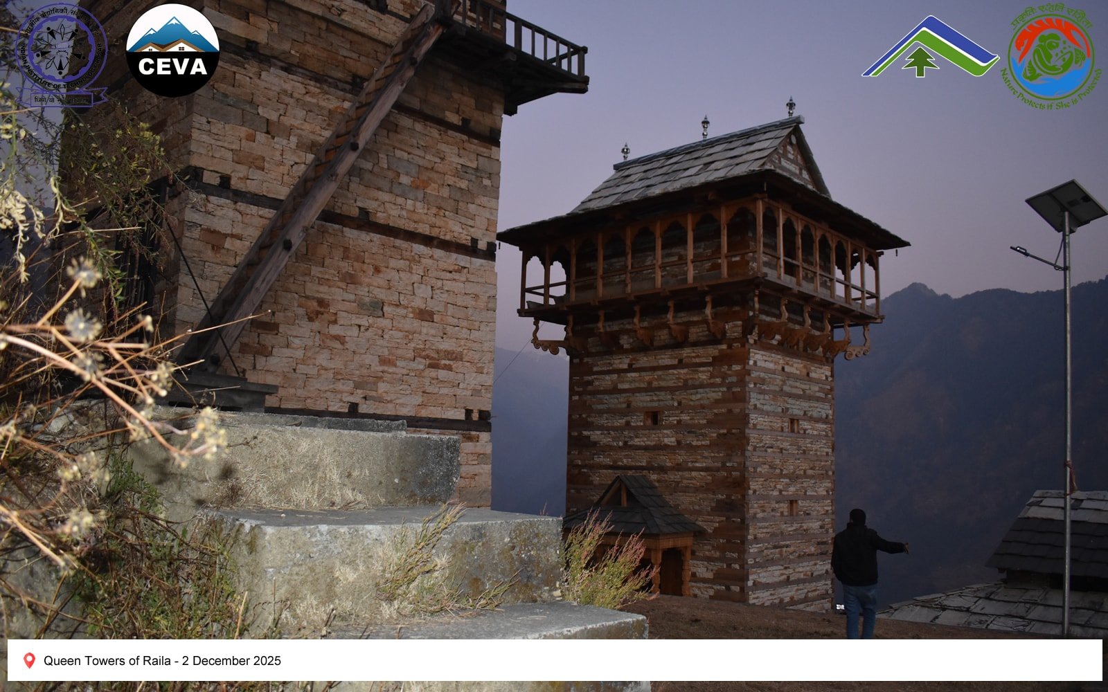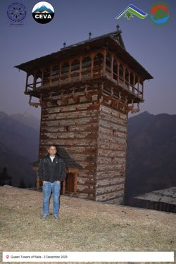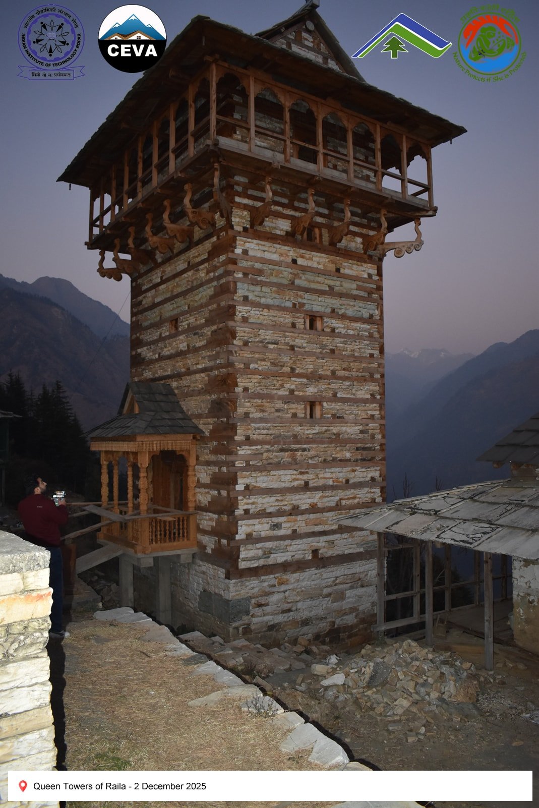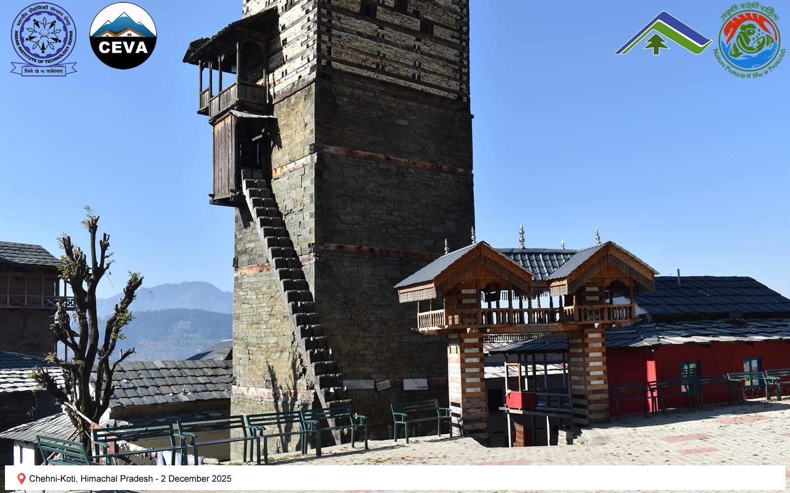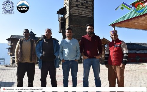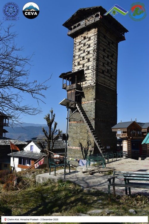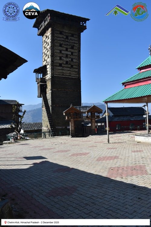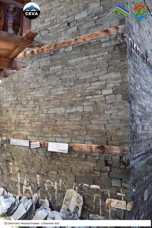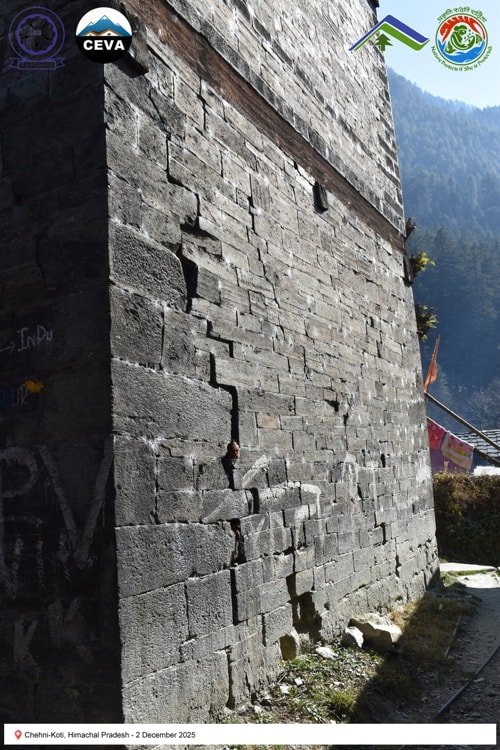 On 2 December 2025, the CEVA team documented heritage structures in seismically active regions of Himachal Pradesh. Chehni-Koti, an approximately 85-foot-tall Kath-Kunni tower, exemplifies traditional earthquake-resilient construction. Located in a zone that has experienced major seismic events—including the Kangra (1905), Kinnaur (1975), Chamoli (1949), Uttarkashi (1991), Sikkim–Nepal (2011), and Gorkha (2015) earthquakes—the tower’s upper portion, built with a composite system of interlocked timber and stone, was damaged during the 1905 Kangra earthquake and subsequently reconstructed. Its survival and repair highlight the adaptive capacity and resilience embedded in vernacular Himalayan building practices.