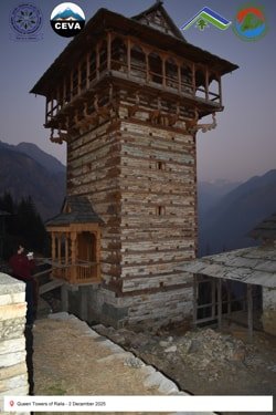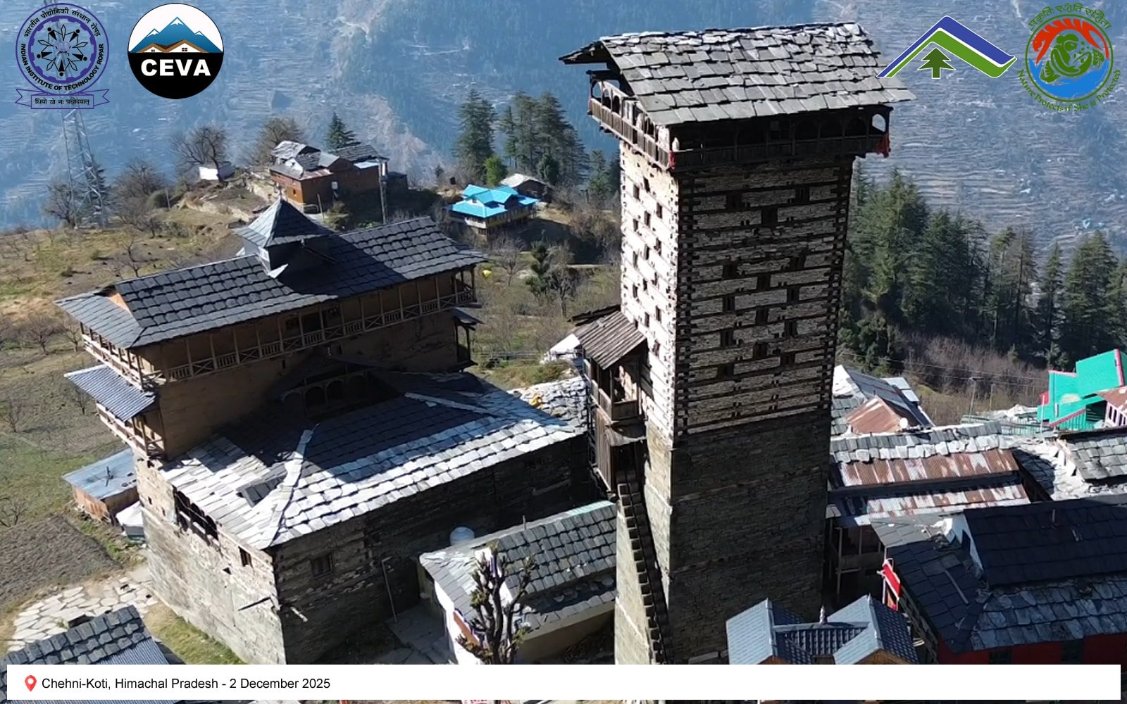 On 2 December 2025, the CEVA team documented heritage structures in seismically active regions of Himachal Pradesh. Chehni-Koti, an approximately 85-foot-tall Kath-Kunni tower, exemplifies traditional earthquake-resilient construction. Located in a zone that has experienced major seismic events—including the Kangra (1905), Kinnaur (1975), Chamoli (1949), Uttarkashi (1991), Sikkim–Nepal (2011), and Gorkha (2015) earthquakes—the tower’s upper portion, built with a composite system of interlocked timber and stone, was damaged during the 1905 Kangra earthquake and subsequently reconstructed. Its survival and repair highlight the adaptive capacity and resilience embedded in vernacular Himalayan building practices.